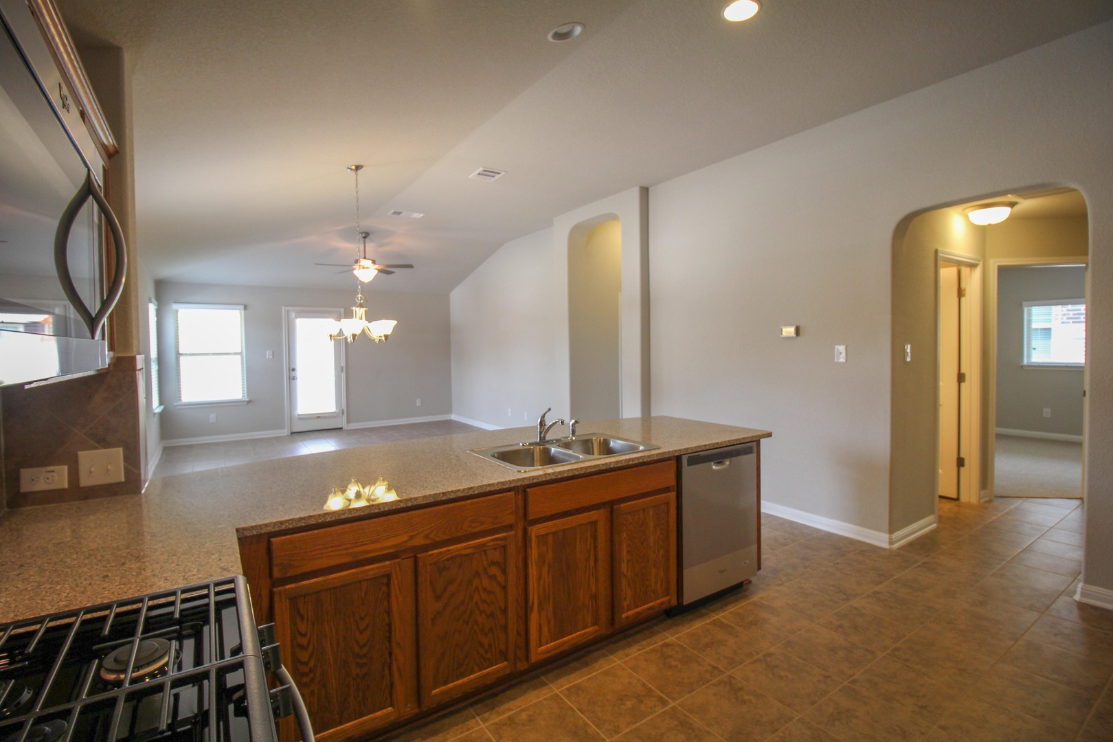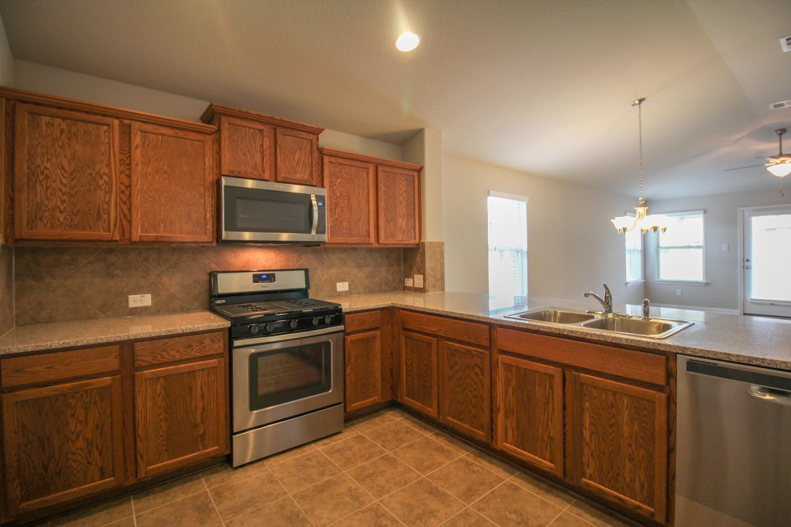They include 3 bedrooms, 2 baths, open concept, tile in entry, dinning room, kitchen, living room, and bathrooms. Master bath separate garden tub and walk in shower. Fenced in back yard with sprinklers, covered patio with BBQ gas connection, and 2 car garage. Lovely community park, swimming pool and extensive walking trails. Easy access to Medical Center and Lackland AFB. Stainless steel appliances with 5 burner gas stove.